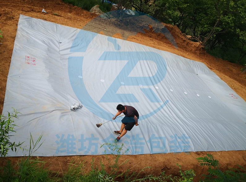 將集水膜覆蓋在堆制斜坡面,用鐵桿將扣眼固定在地面。
